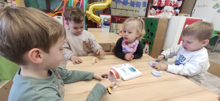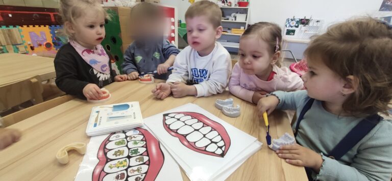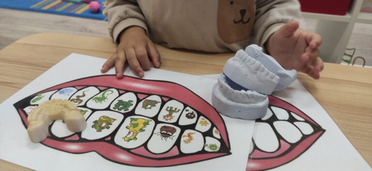 S djecom smo provodile aktivnosti četkanja “bakterija” koje su se nalazile na predlošku. Djeci se jako svidjela ova aktivnost. Ponudile smo im i modele zubiju (otiske) koji su im bili jako zanimljivi za promatranje i istraživanje. Već od jasličke dobi djecu učimo da imaju pozitivan stav prema oralnoj higijeni te koliko je ona zapravo važna za daljnji rast i razvoj. Kako smo “očetkali” bakterije sa zubiju možete pogledati kroz par slika….