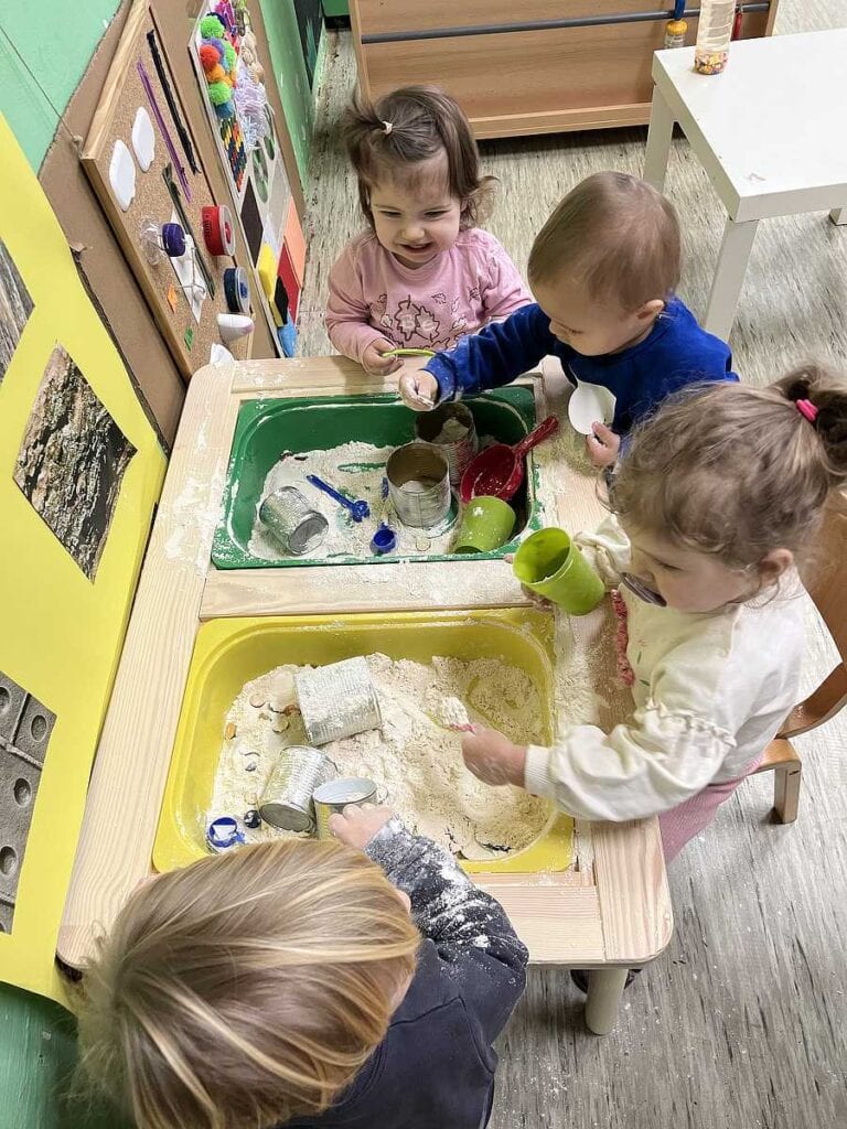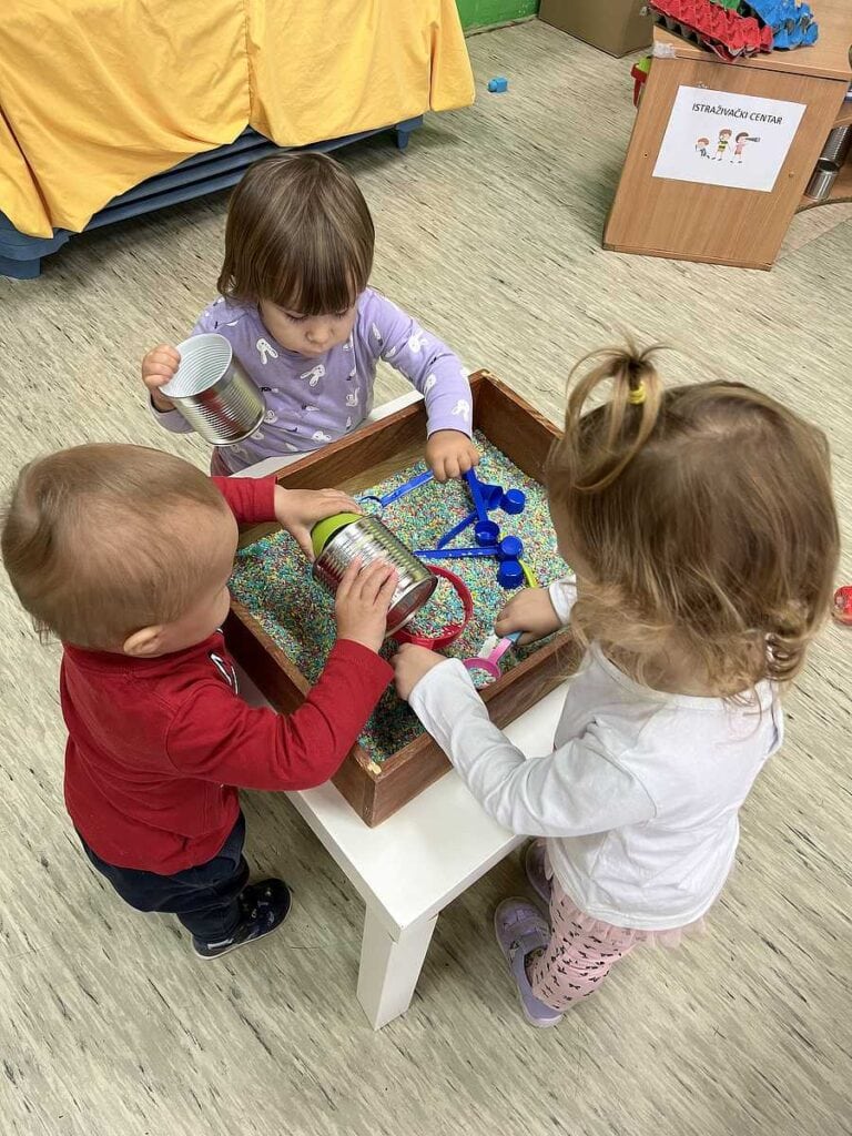 U Kockicama se tako nastoji ponuditi što više poticaja i stvoriti što više mogućnosti u kojima će se zadovoljiti djetetova potreba za igrom, istraživanjem i učenjem, ali uzimanjem u obzir i njihove interese. Tijekom ove pedagoške godine u mlađoj jasličkoj skupini Kockice djeca su pokazala najveći interes za igrom s rastresitim materijalom. Ona je izuzetno vrijedna jer omogućuje djeci da istražuju svojstva materijala, težinu, protočnost, brzinu, količinu i slično, a također poticajno djeluje na razvoj senzomotorike, fine motorike, koncentracije i pažnje uz uvijek prisutan element opuštanja i zadovoljstva.